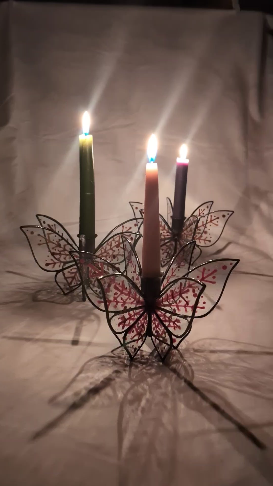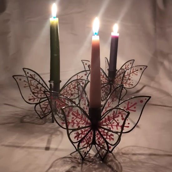 Lovely glass décor for your holiday table. This stained glass taper candlestick holder is sure to become a future heirloom. It has been lovingly handcrafted with antique mouthblown clear glass with a gorgeous textured 'wavy glass' look. The glass had been painted and fired with a vitreous glass paint with a snowflake design in an earthy rust color, meant to go from Thanksgiving through Christmas.