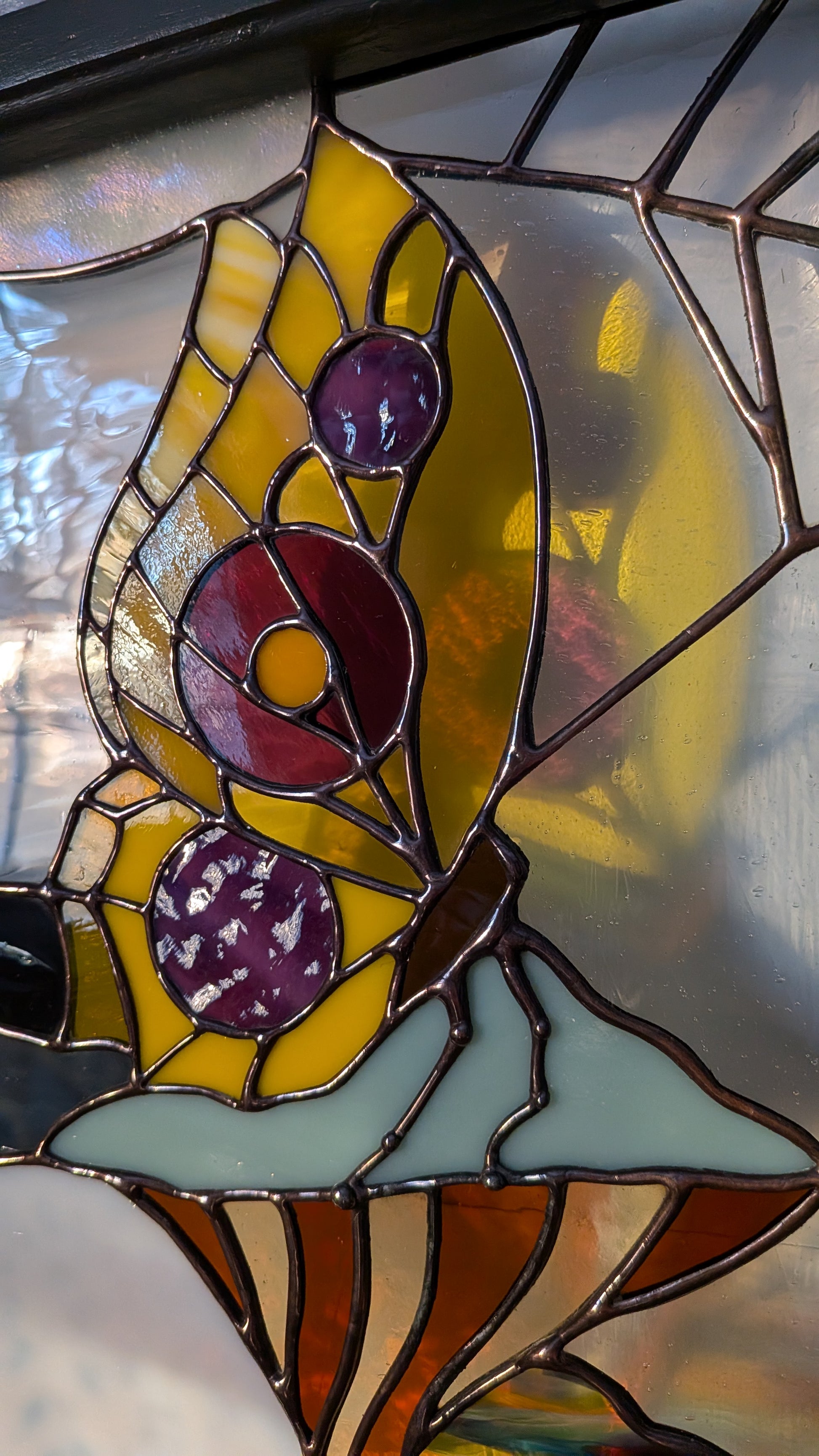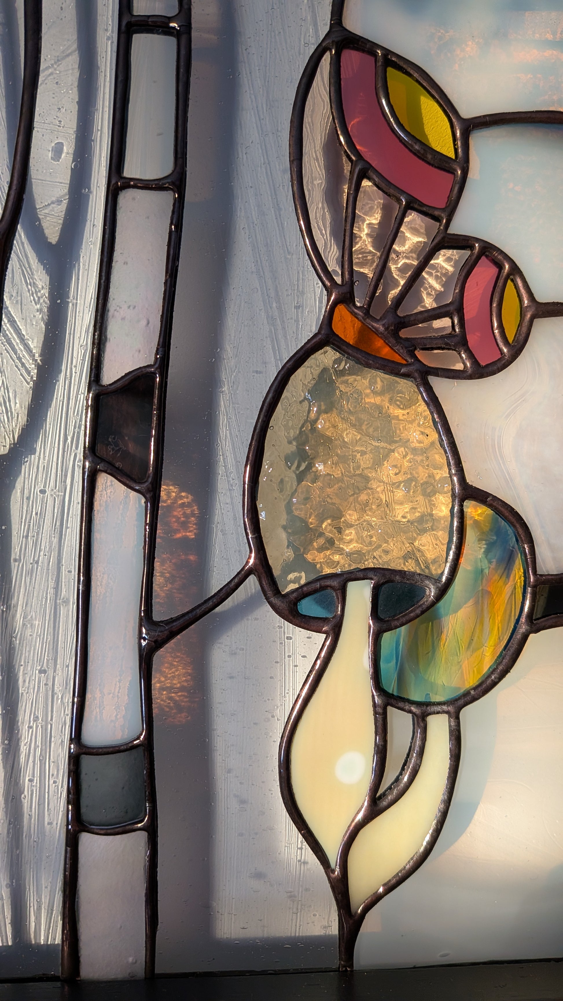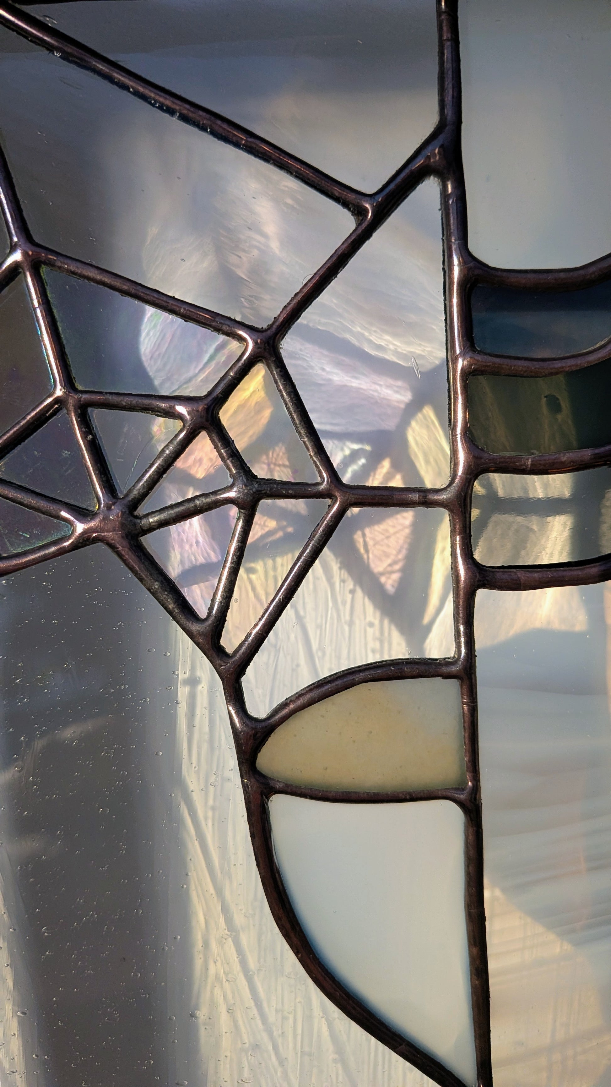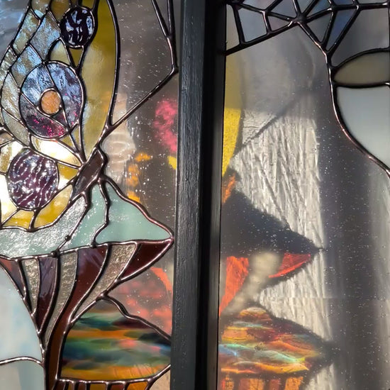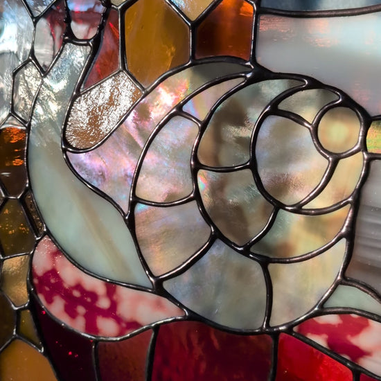 Note: Stained glass is so special and unique because of the way the appearance shifts and changes as the light around it changes. I've included so many photos here in order to show the varying colors and textures: front lit, back lit, and something in between. If you would like to see more images, or arrange for a studio visit, please reach out.
