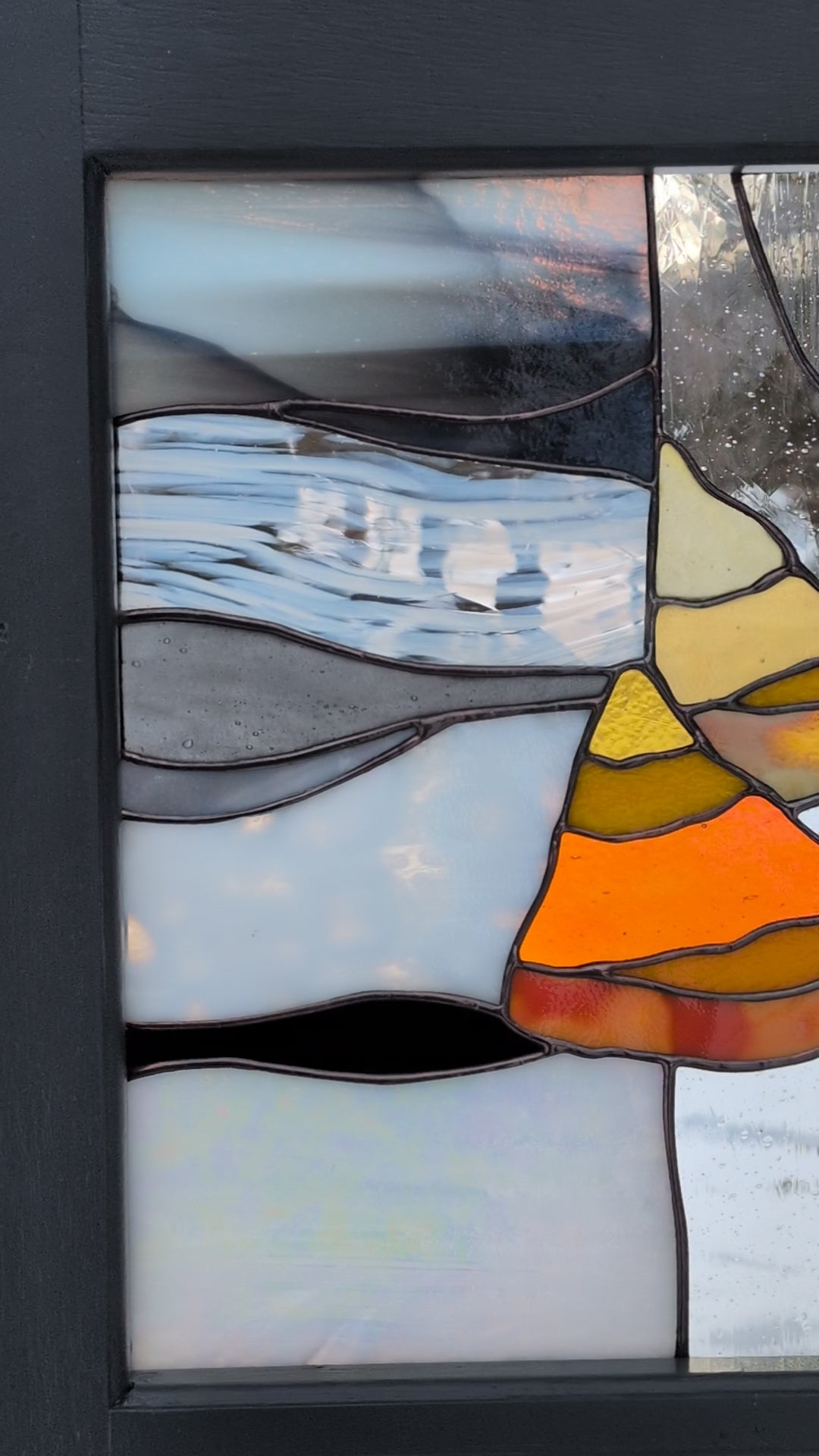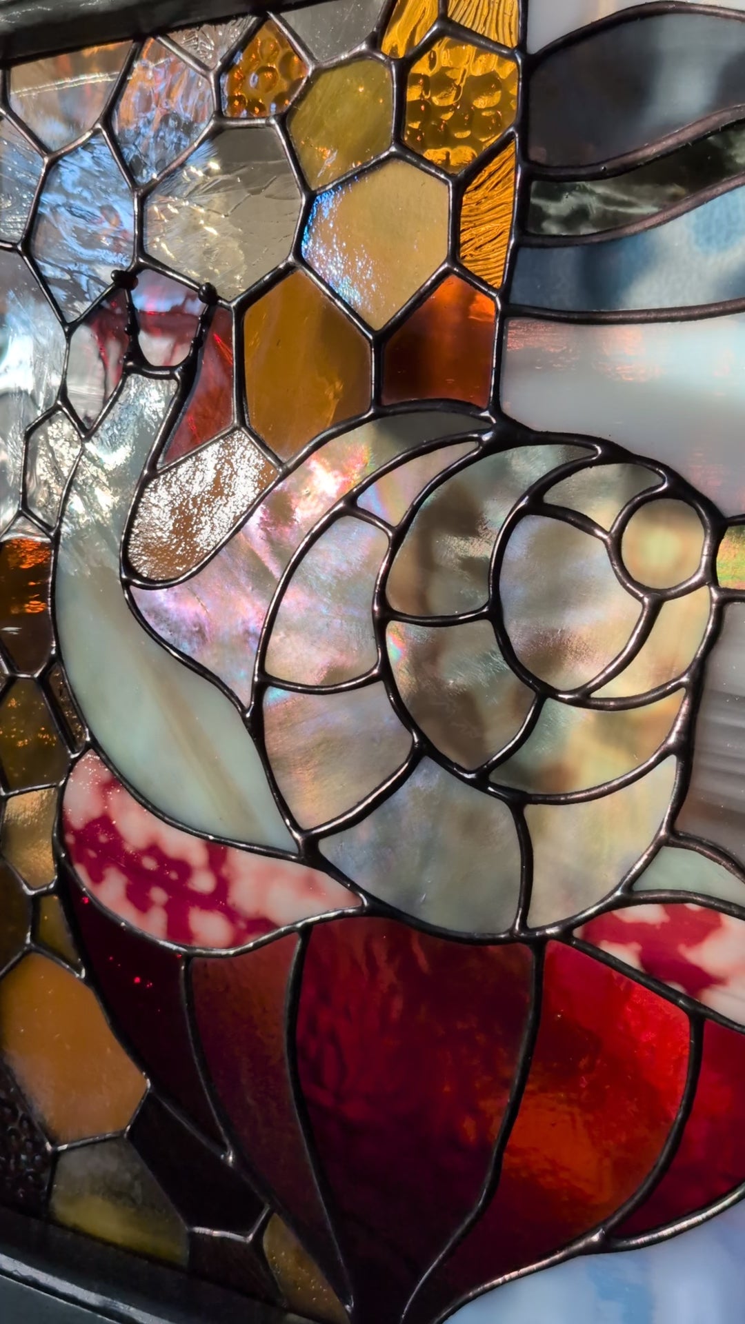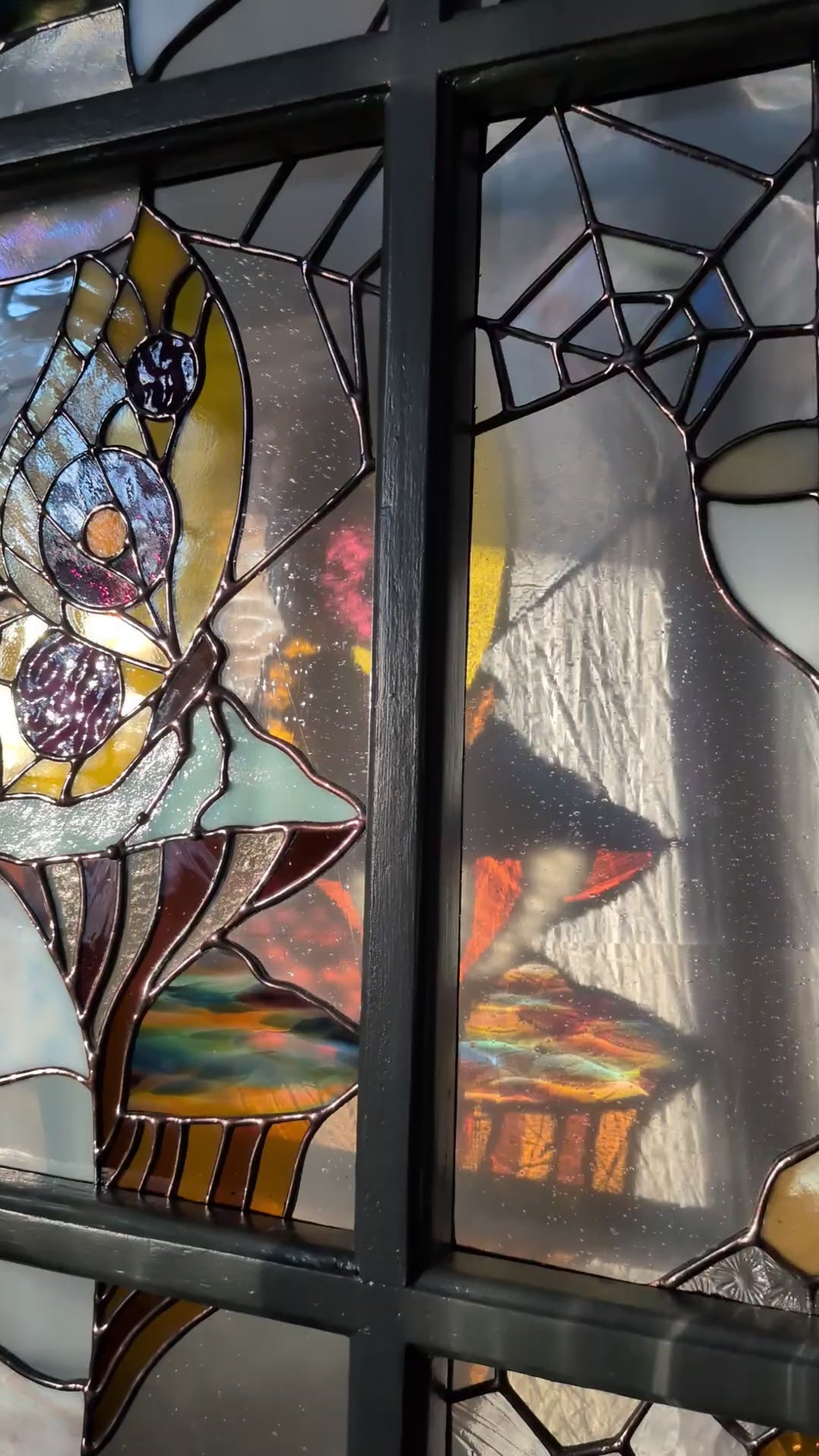 Note: Stained glass is so special and unique because of the way the appearance shifts and changes as the light around it changes. I've included so many photos here in order to show the varying colors and textures: front lit, back lit, and something in between. If you would like to see more images, or arrange for a studio visit, please reach out.
