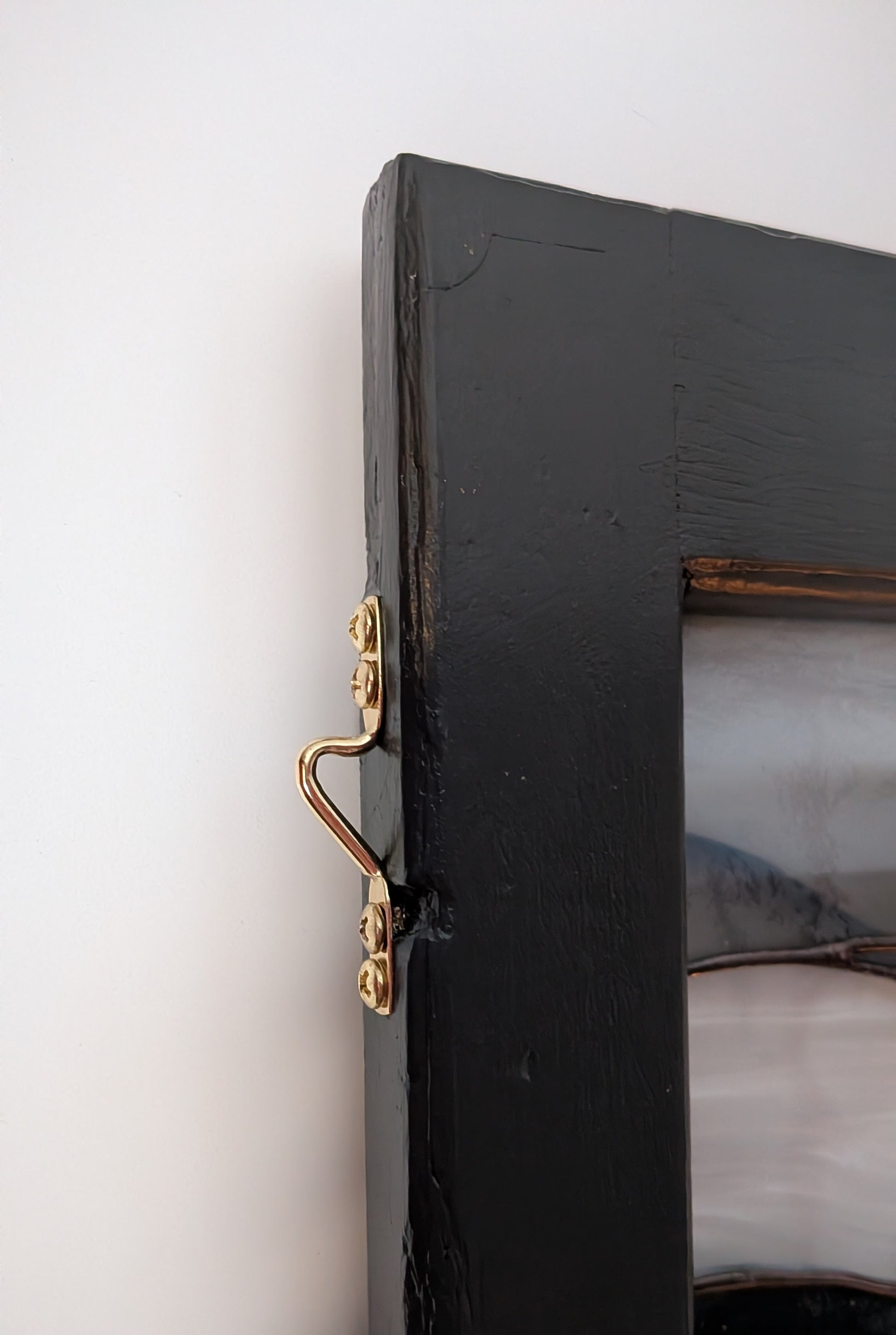 The eight individual panes are installed in a vintage window frame. The frame has been carefully refinished in a warm black color. It measures 22" x 54". Brass hangers are installed for hanging. I can visualize it hanging in an open concept space to help define areas of the room, or leaning nestled in a sunny window. The hangers could be easily removed if the sash is to be installed in a window opening. It would be perfect as a sidelight in a front entry, or even custom built into a one of a kind door! Swoon!