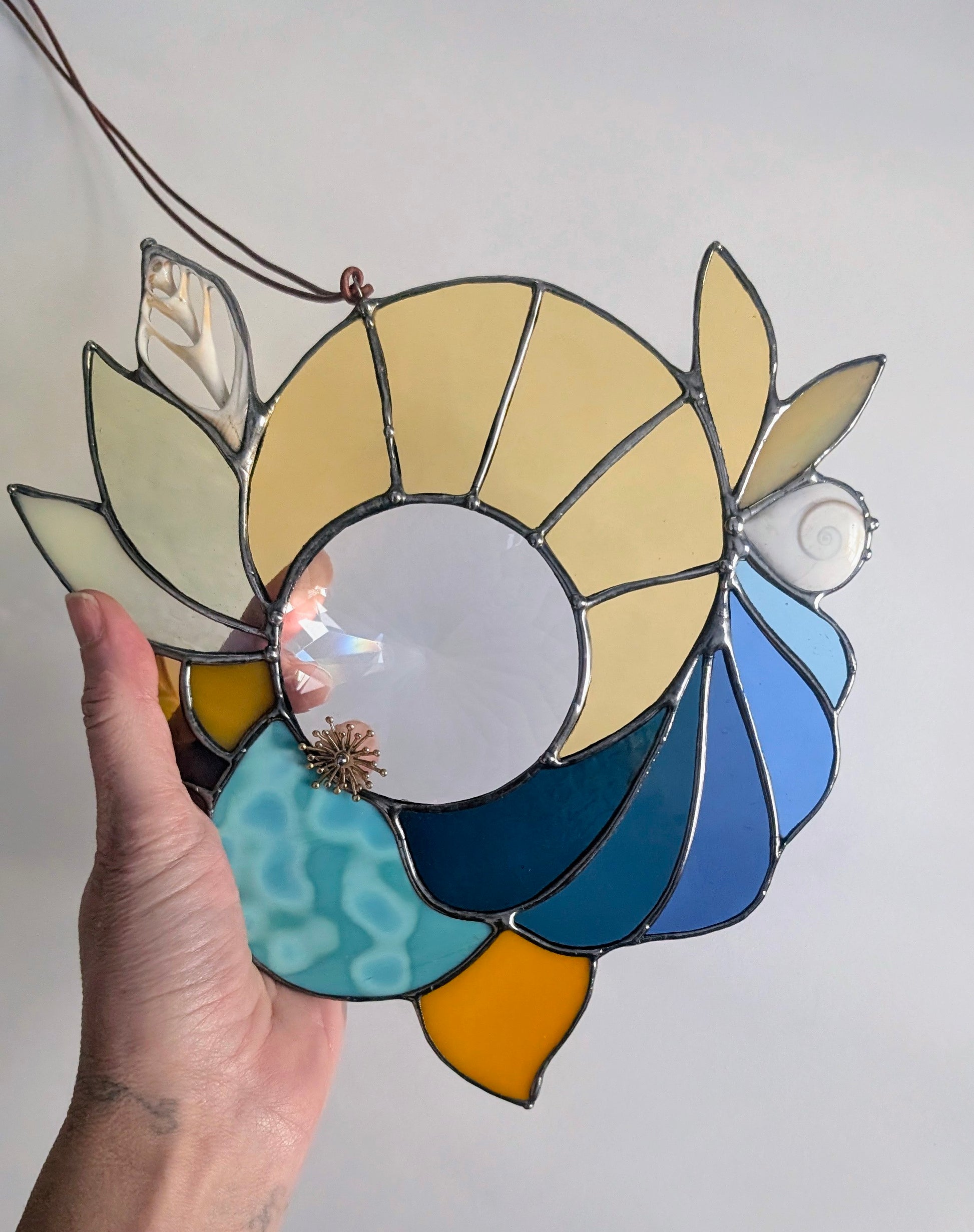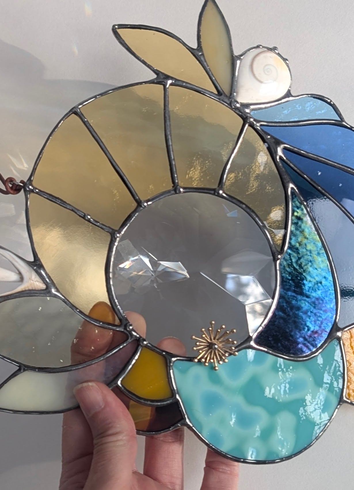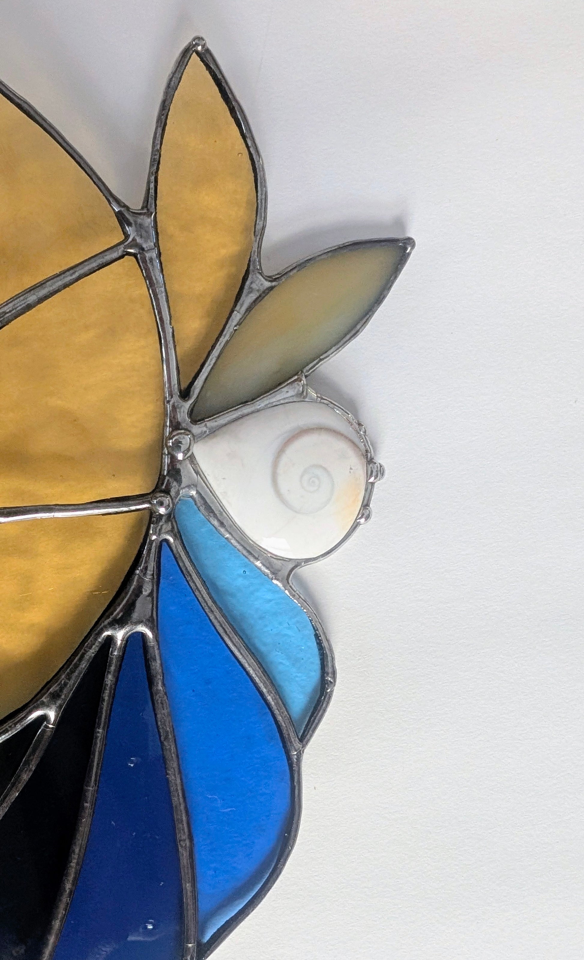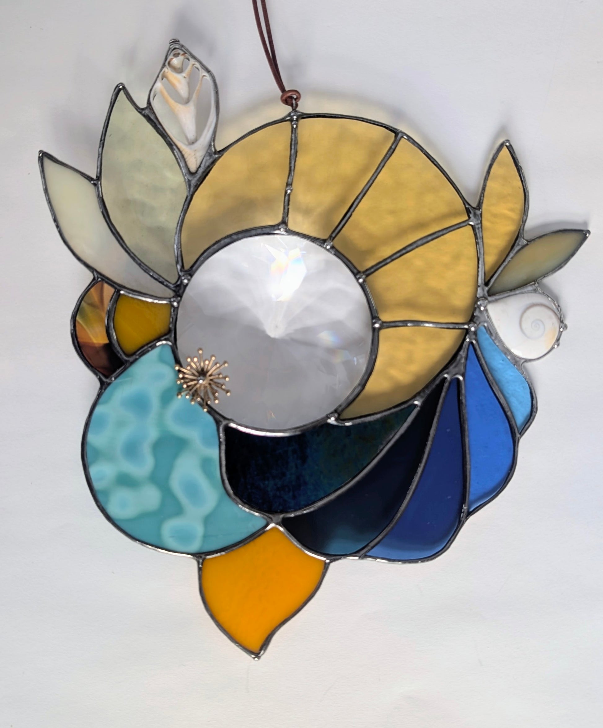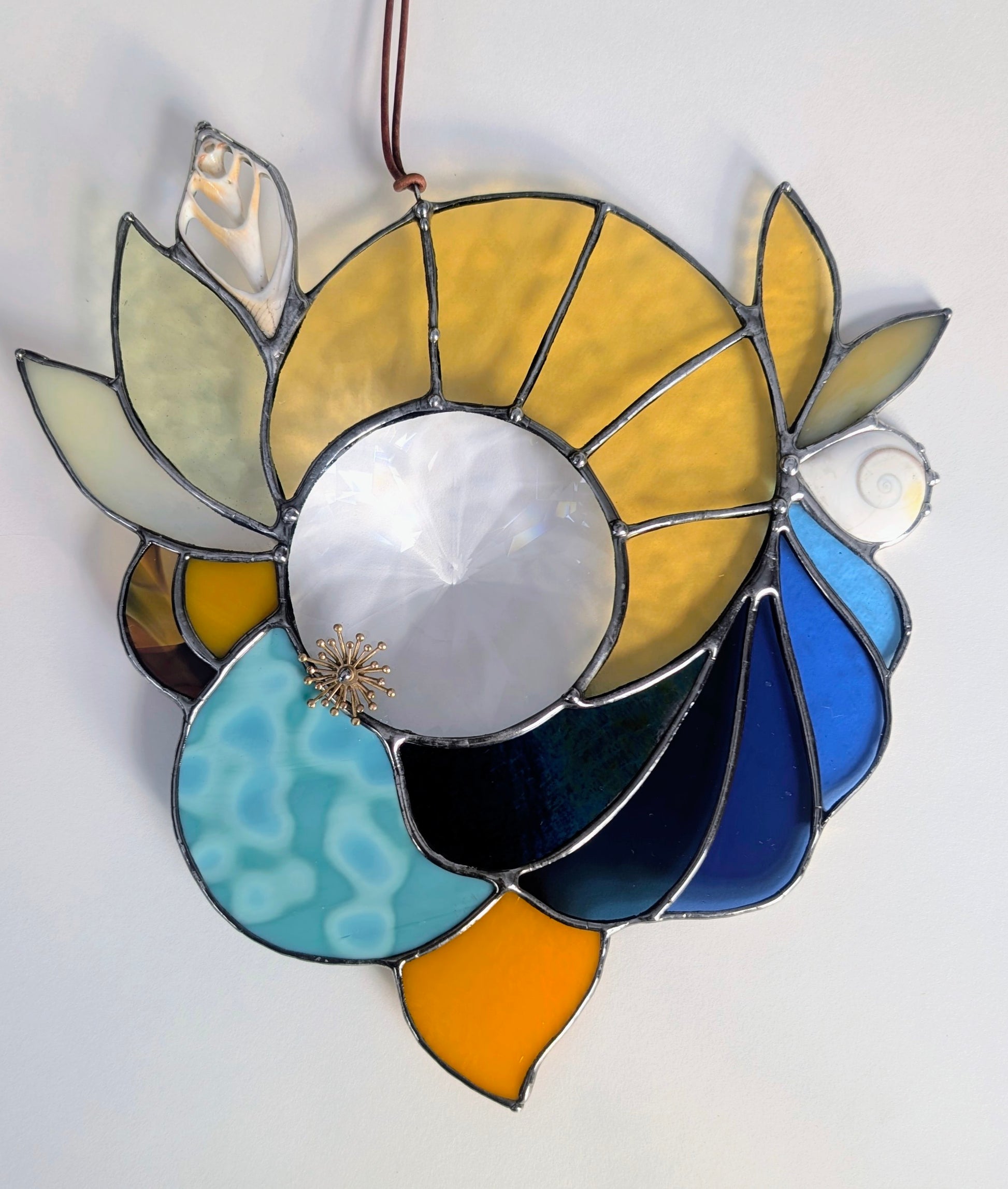 Carefully handcrafted, the colorful stained glass surrounds a very sparkly faceted cut glass crystal. The crystal throws tiny rainbows all around the room when the sun shines through. The array of blue and warm yellow art glass is dotted with a few oceanic specimen - a slice of a Whelk shell and a "Shiva's Eye", an Operculum shell. This panel is a miniature celebration of nature's quirky beauty.