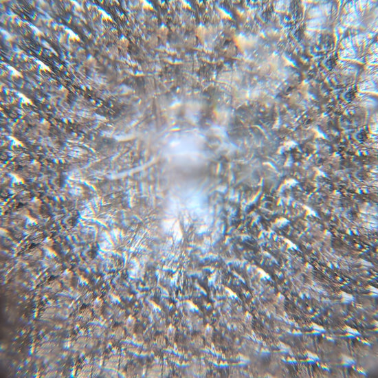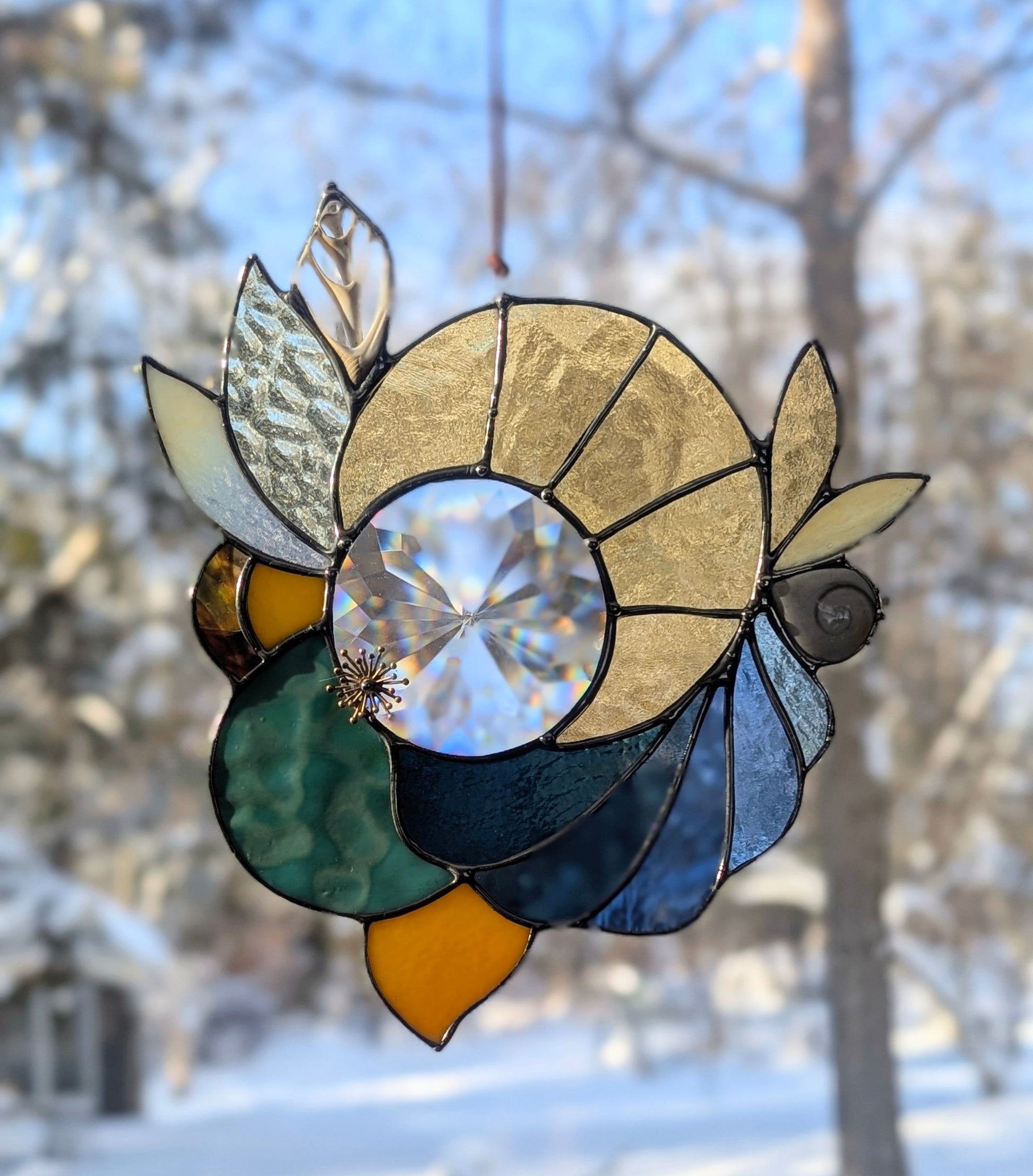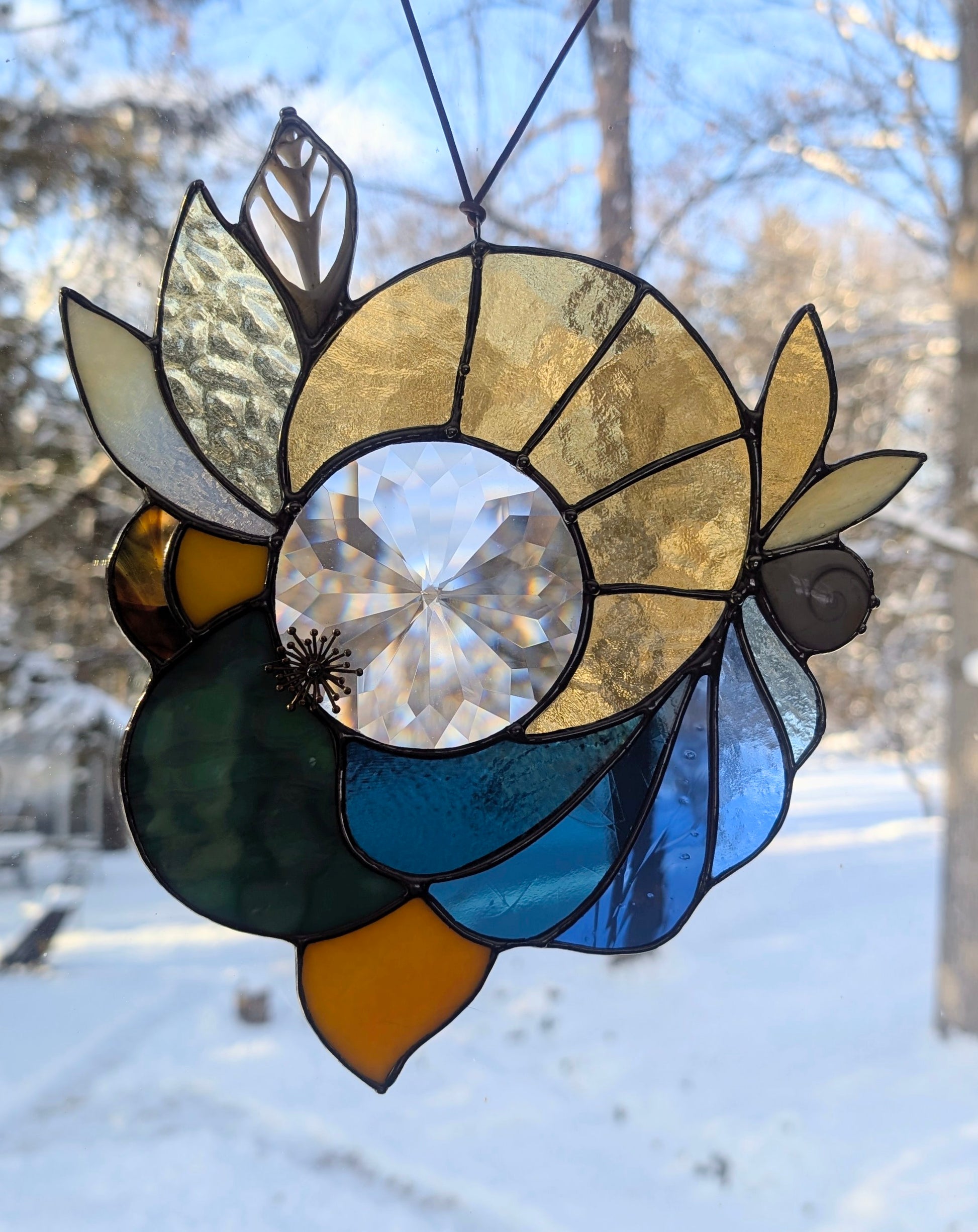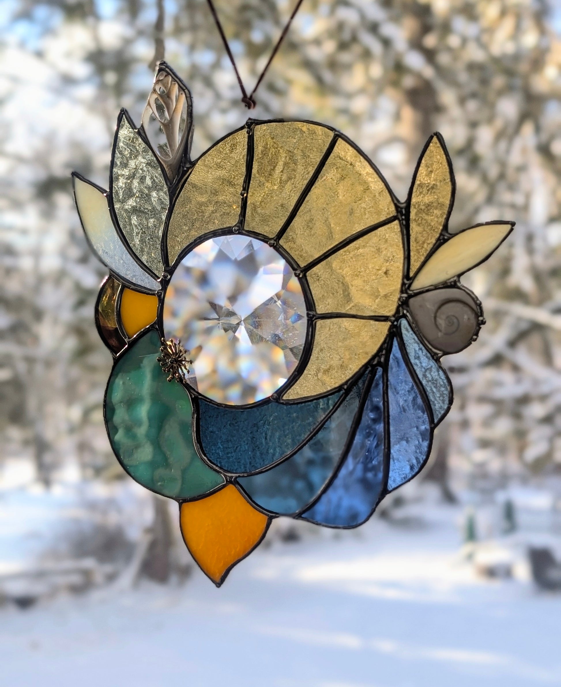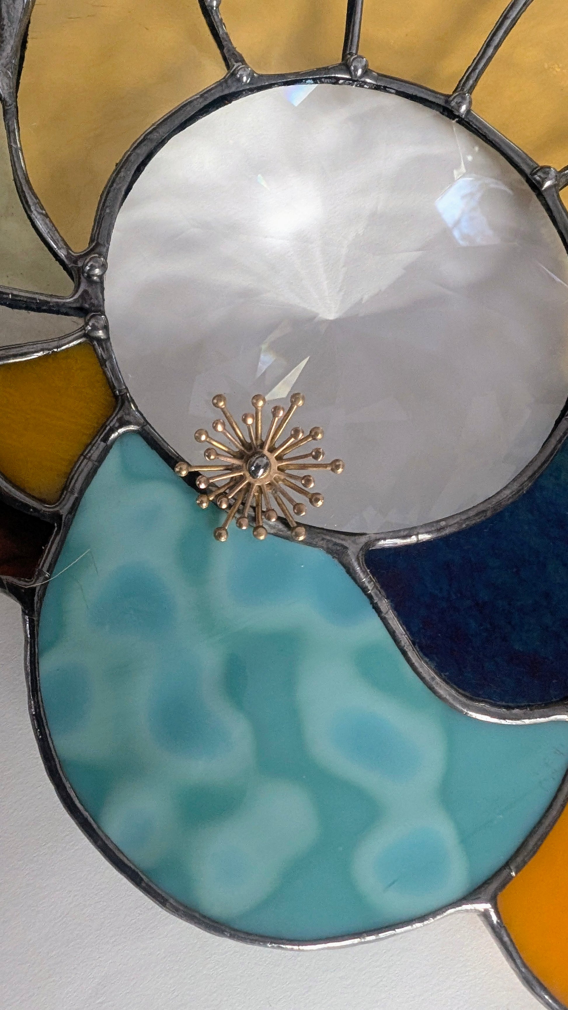 Carefully handcrafted, the colorful stained glass surrounds a very sparkly faceted cut glass crystal. The crystal throws tiny rainbows all around the room when the sun shines through. The array of blue and warm yellow art glass is dotted with a few oceanic specimen - a slice of a Whelk shell and a "Shiva's Eye", an Operculum shell. This panel is a miniature celebration of nature's quirky beauty.