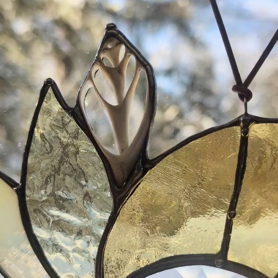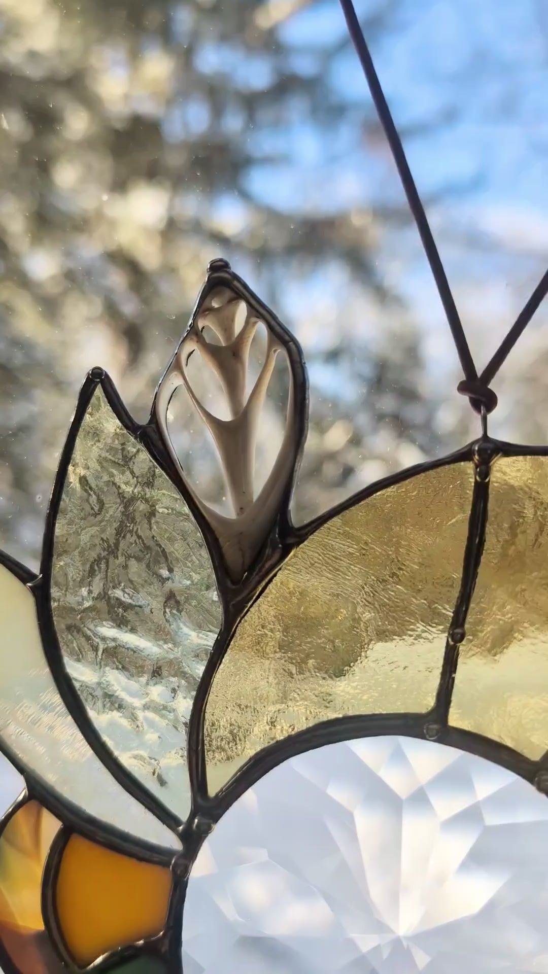 The large suncatcher is strung with leather cord, ready to hang in your sunny window. It measures 9" across by 10" tall.